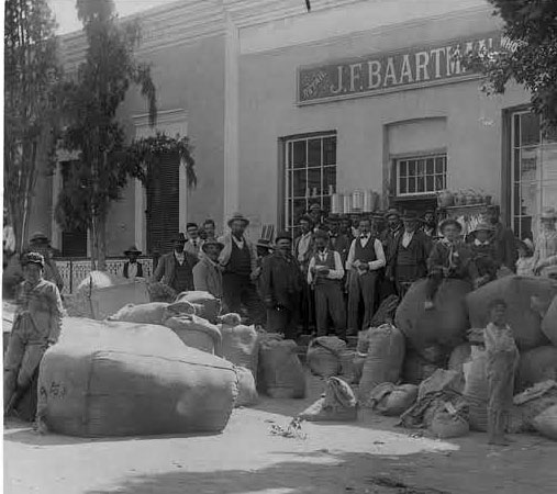 In the fighting round the town in 1900 The Military were always commandeering trained horses and the time came when no one had any horses left [according to De Jager horses were even sent as far as Grahamstown in the Eastern Cape to prevent the Boers getting mounts] and people came with scotch carts and wagons drawn by oxen to get their provisions every 14 days, and then on permits allowing a certain quantity according to the number of people on the farm. Those days must have been anxious days for J.F. Baartman, as he had to be sure that nothing was put on any vehicle that was not included in the permit as the carts were liable to be inspected by the guards stationed at the top and bottom of the town. I remember seeing a big horse breeder like Mr. Van Zyl [probably from the farm Hangklip] coming to town with his tent cart drawn by two oxen, with Mrs. Van Zyl in the cart and he walking alongside, and the boy leading the oxen.