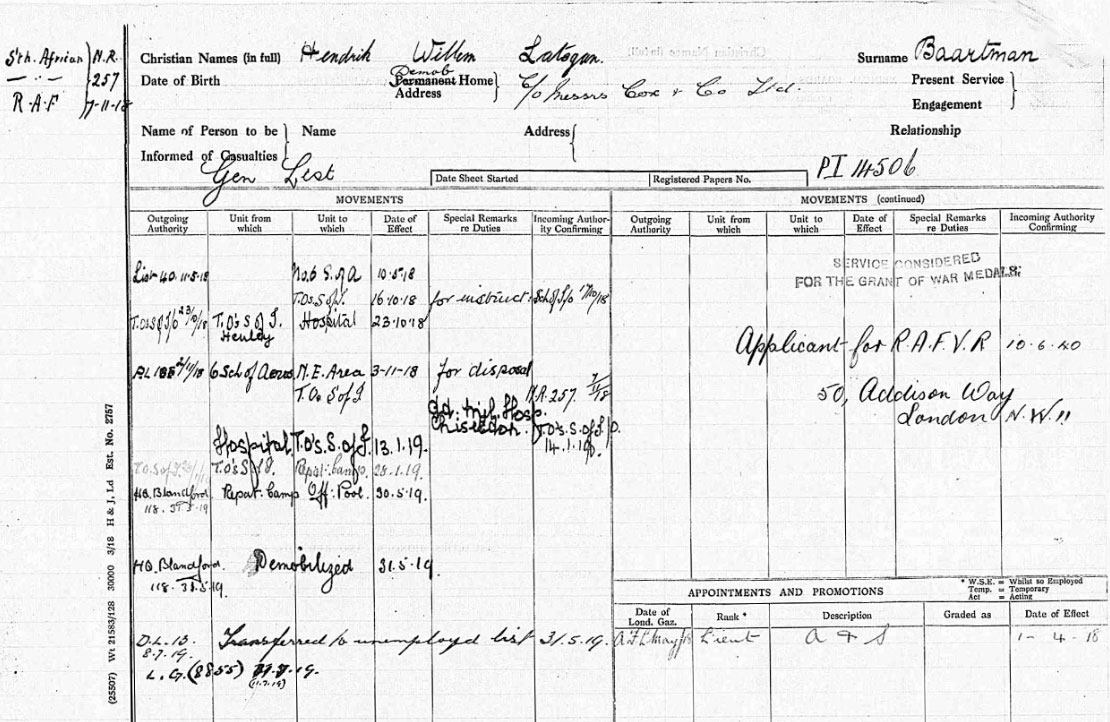 1940 Jul 18. The undermentioned are granted commissions for the duration of hostilities as Pilot Officers on probation: —Hendrik Willem Lategan BAARTMAN (82465).