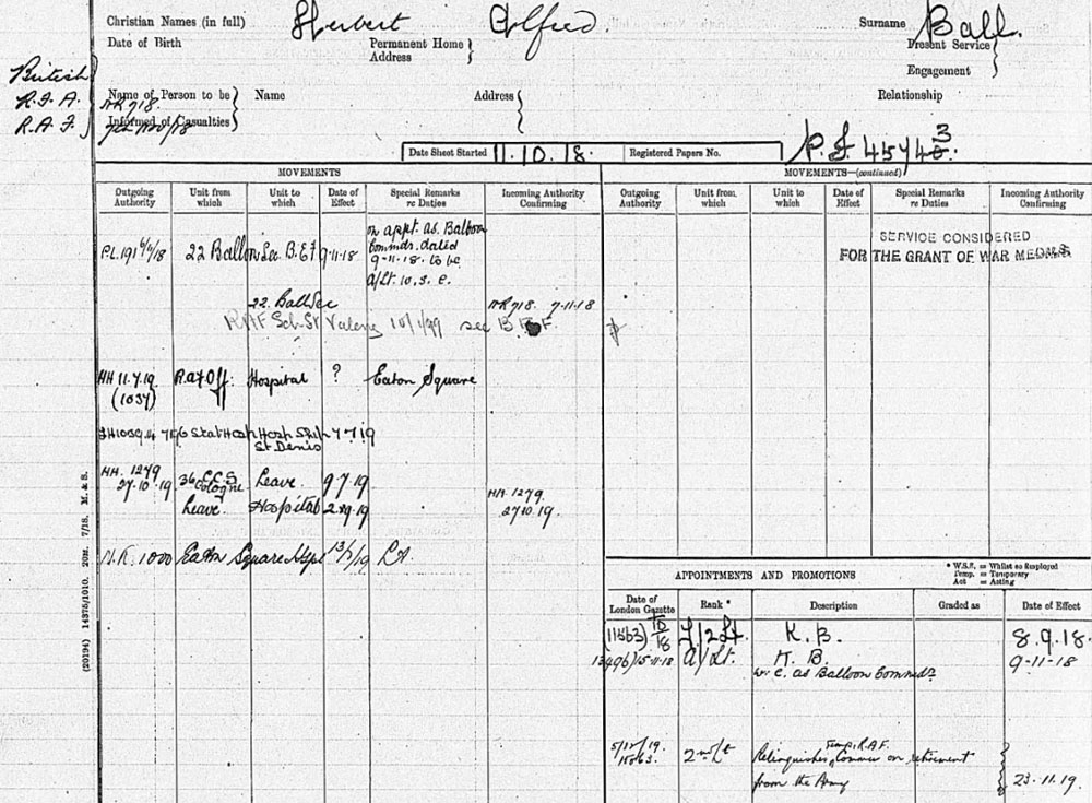 1918 Nov 9. 2nd Lt H A Ball MM to be temp Lt while employed as a Balloon Commander