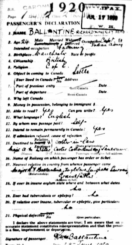 1920 Jul 17 Arrives Canada from UK. His intention is to settle