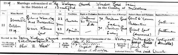 1919 Oct/Dec. Married Brentford, Middlesex to Olive N Law