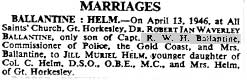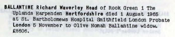 1946 Jun 28. The King has been graciously pleased to sanction the following Promotions in, and Appointments to, the Venerable Order of the Hospital of St. John of Jerusalem: —as Brother - Captain Richard Waverley Head Ballantine.