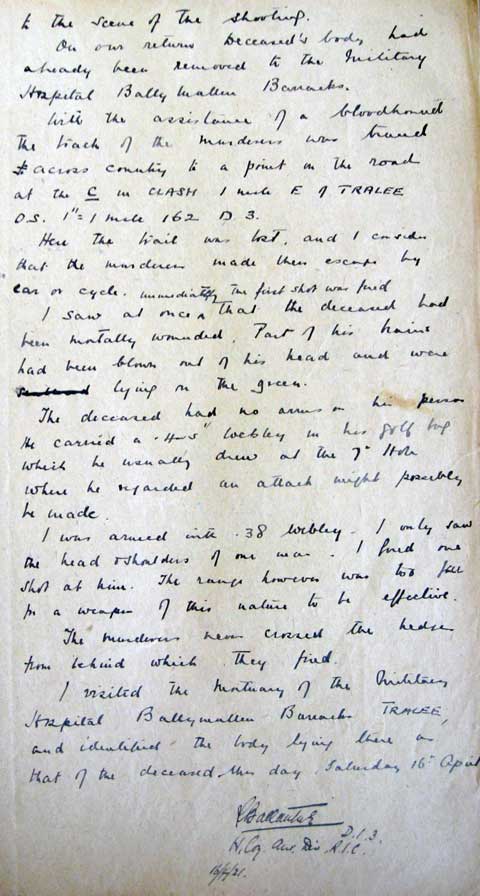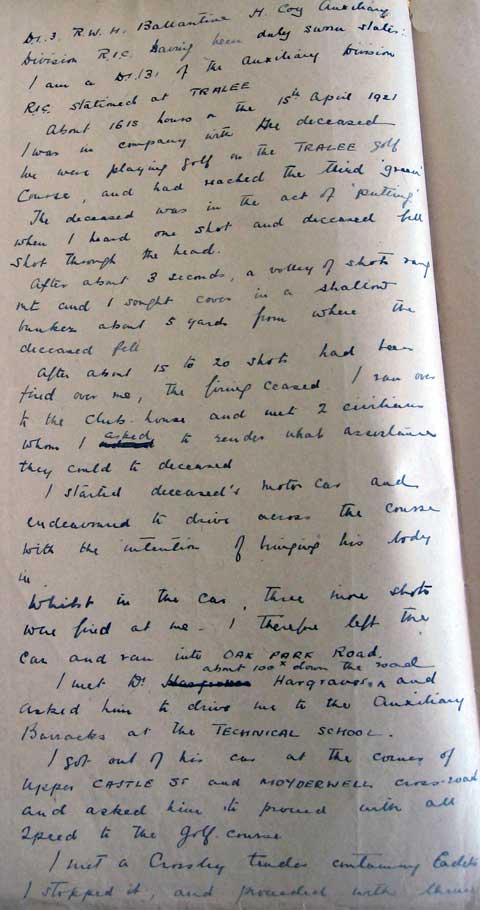 1921 Apr 15. Major J A MacKinnon commanding officer of H coy in Tralee. Shot while off duty and playing golf in Tralee with DI.3 R W H Ballantine (ADRIC no 935). The IRA knew that he played golf here regularly, and had kept watch on the golf course for about 2 weeks before their chance came. The hit squad was a sniper with a rifle, James Cornelius Healy a veteran of WW1, and three men with shotguns, Johnny Riordan, Tommy Barrett and Jack Mason. Healy hid in a tree overlooking the third green and waited till Mackinnon was perfectly still as he shaped to hit the ball. Healy shot MacKinnon twice in the head. The others opened up with shotguns, and all the IRA men were able to escape in the resulting confusion. The Auxiliaries went on a series of reprisals, which in turn led to IRA killings.