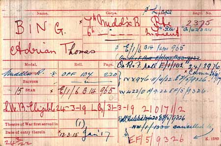 1917 Sep 26. Commissioned from Officer Cadet Unit. Middlesex Regt. Adrian Thomas Bing.