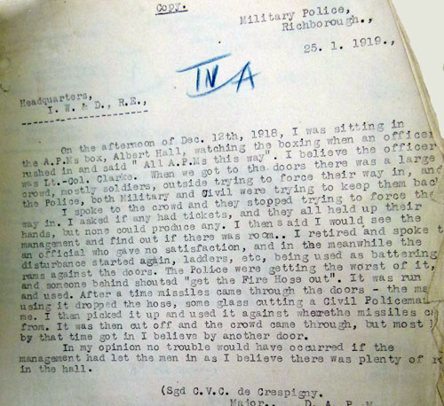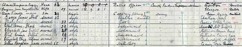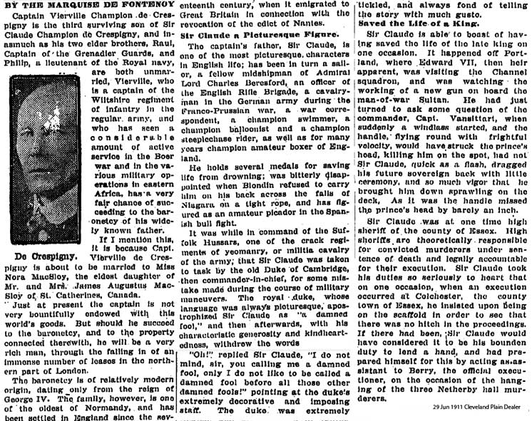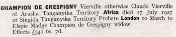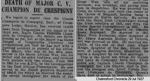1909Oct 13. Hull Daily Mail, ,Captain Claude Vierville Champion de Crespigny was summoned at Witham (Essex) on Tuesday, for assaulting Ernest Sorrell, a butcher, of Hatfield Peverel, on September 26th. Complainant stated that he was driving in a trap with a friend past the entrance gates to Champion Lodge, when the defendant accused him of having with a whip struck his dog, which was playing in the road. Sorrell denied that he had touched the dog, but Captain Champion de Crespigny took hold of his coat and pulled him out of the trap. While he was on the ground the captain struck him three times, and blackened his eye. For the defence, Captain Champion de Crespigny said his dog was slashed by the driver of the trap, and he considered he had a right to hit the man. Defendant's mother and a sister gave evidence that there was provocation through the defendant's dog being hit with a whip. Captain Champion de Crespigny pleaded guilty to the assault, and was fined £2 and £2 14s costs.