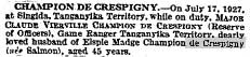1927 Jul 17 Died in Singida, Tanganyika aged 47. His widow died 10 Jul 1959. He had been a game ranger there. Some reports said it was a "huntng accident" but no details were given