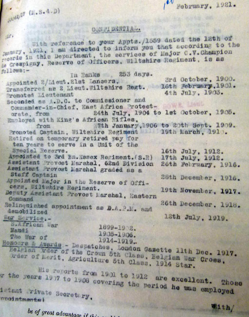 1906 Jan 7. The Duke of Edinburgh's (Wiltshire Regiment), Lieutenant Claude V. Champion de Crespigny is seconded for service under the Colonial Office. He served with King's African Rifles for 2 years