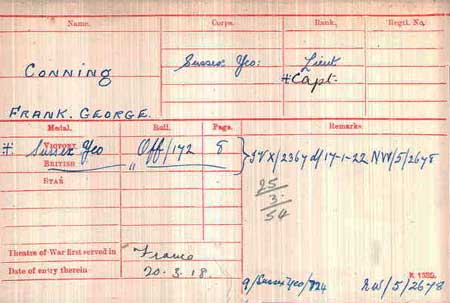 1918 Jun 12. Essex R. The undermentioned Lts. (Yeo., T.F.) to be actg. Capts. while comdg. a Co.: — F. G. A. Conning.