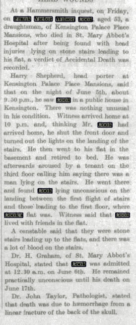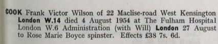 1939 Register . Living at 54 Kensington Court , Kensington, London. He is an unemployed Elect & Wireless Supt.