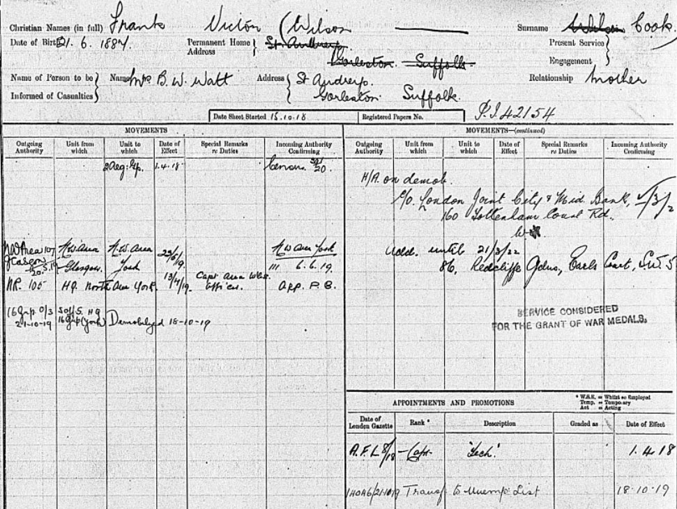 1911 census at 15 Church Rd, St Andreys, Gorleston On Sea. with mother and step father. Same address on RAF record. Note he is listed as "Victor Frank"