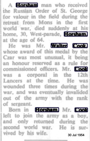1916 Apr 15 MC Gazetted. Second Lieutenant Walter Charles Cook, The East Surrey Regiment, attached 7th Battalion. For conspicuous gallantry and devotion to duty when holding a crater with his platoon. He controlled his men skillfully, showed great disregard of danger, and for 48 hours held his position with coolness and resource, repelling in all three hostile attacks. Subsequently he made gallant attempts to erect wire under very heavy fire.