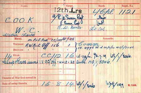 1917 Oct 14. R.W. Surr. R. Temp. Capt. (actg. Maj.) W. C. Cook, M.C. (2nd Lt., E. Surr. R.), from E. Surr. R., to be temp. Capt