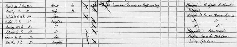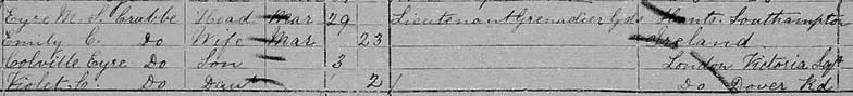 1878 Mar 20 Born in St George Hanover Sq, Victoria Square, London - Colville Cornwallis Albert Eyre Crabbe . His father, Eyre Macdonnell Stewart Crabbe, CB, b. 1852 d. 1905 was a Grenadier Guards officer, son of Colonel Eyre John Crabbe b. 1791 d. 1859 who as a teenager joined the 74th regiment, fought all through the Peninsular war, eventually rose to be the CO of the Regiment, and restored it to being a highland regiment just before he retired in 1845 and married. EMSC was his only child, son of a second marriage. EJC’s father was Colonel Joseph Crabb b. 1742 d. 1791 who was in the East India Company’s army at the time of Warren Hastings.