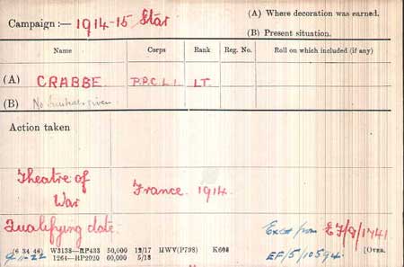 1914 Aug 1. Enlisted in Ottawa. His next of kin was L.E. Crabbe (brother), c/o Admiralty, Royal Navy & of Seaford, England. His attestation shows 10 years service in HLI, Sussex Yeomanry, Warwick Militia.