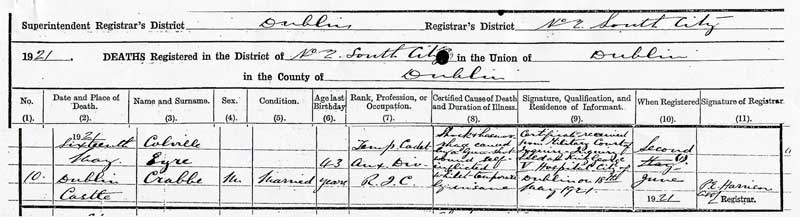 1921 May 16. Died in Dublin - suicide. The Military Inquest concluded that it was suicide and that he "appeared very depressed last month"