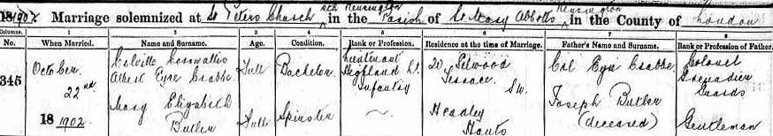 1902 Oct 22. Married to Mary Elizabeth Butler at St Peter's, Cranley Gardens, Kensington, London