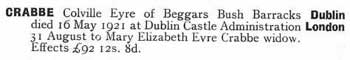 Notice is hereby given, that all creditors and other persons having any debts, claims or demands against the estate of Colville Eyre Crabbe, late of Beggars Bush Barracks, Dublin, Ireland, a Cadet in the Auxiliary Division of the Royal Irish Constabulary (who died on the 16th day of May, 1921, and letters of administration of whose estate were granted in the Principal Registry of the Probate Division of His Majesty's High Court of Justice, on the 31st day of August, 1921, to Mary Elizabeth Eyre Crabbe, of Vane Cottage, Billingshurst, Sussex, Widow, the administratrix), are hereby required to send particulars, in writing, of their debts, claims or demands to us, the undersigned, as Solicitors to the said administratrix, on or before the 15th day of December, 1921, after which date the said administratrix will proceed to distribute 'the assets of fine said deceased amongst the persons entitled thereto, having regard only to the debts, claims and demands of which we shall then have had notice; and that we will not be liable for the assets, or any part thereof, so distributed, to any person or persons of whose debt, claim or demand we shall not then have had notice.—Dated this 8th day of November, 1921