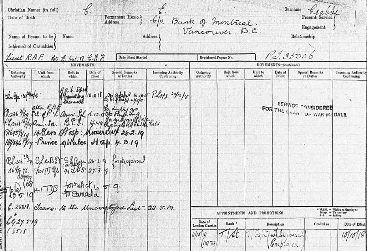 1918 Oct 10. Admin Branch of RAF. The undermentioned are granted temp, commns. as Lts.: C. E. Crabbe, M.C. (late Capt., E. Ont. R., C.E.F.), and to be temp. Capt. whilst specially empld. RAF service is online
