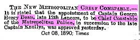 1891 Feb 25. Capt G H Dean presented by Col Sir Edward Bradford at a Queens Levee by on the occasion of his appointment as a Chief Constable of the Metropolitan Police
