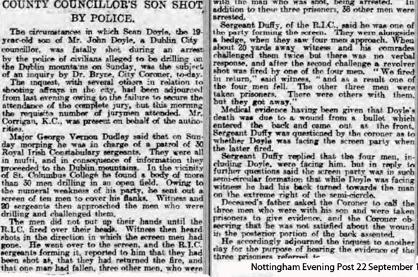 1920 Sep 19. In command of a party of ADRIC men (30 Sergeants) One of them gave evidence at the enquiry WJ Duffy