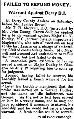 1921. Dudley surfaces again in late 1921 at Magherafelt, between Belfast and Londonderry, where he allegedly embezzled £300 of expenses, due to other policemen. As a result he skipped the country to Glasgow where his wife and family were living. He was arrested and taken back to Dublin in the Spring of 1922. The result of his trial is unknown.