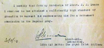 1918 Jan 30 Commissioned. His father is James Dunne MBE, ex-Supt in Dublin Metropolitan Police. He had not been outside UK while an Other Rank