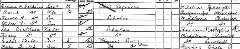 1891 Living with parents at 19 Arlington Park Gardens, Chiswick. His father is a Civil Engineer