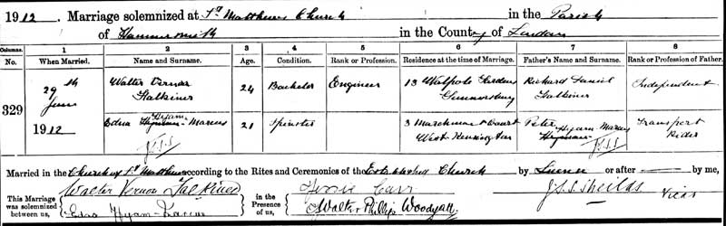 1912 Jun 29 . Married Edna Hyam Marcus at St Matthew Church, Hammersmith. He is living at 13 Walpole Gardens, Gunnersbury