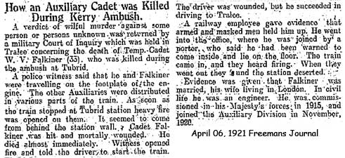 1921 Mar 12. The train from Listowel to Tralee was ambushed by the IRA at 8.45. Falkiner and another Cadet Lomas, were on the footplate. The Irish train drivers were refusing to move trains with uniformed troops and it is likely here that the driver and fireman had been forced to take the train out, with Falkiner and Lomas making sure that the train crew stayed on the job. The ambush took place at Tubrid Railway Station, County Kerry. The Limerick train was attacked by a group of IRA men with a machine gun. The train continued to Tralee in spite of the fact that the engine driver was seriously wounded. I suspect that very few IRA men were involved in this attack, very little appears in the memoirs of local IRA men, other than a couple of lines saying that there was an ambush and one Cadet was killed.