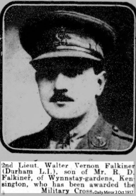 1917 Sep 26. MC gazetted. T./2nd Lt. Walker Vernon Falkiner, Durham. L.I. For conspicuous gallantry and devotion to duty .when in charge of Stokes mortars during an assault on the enemy's trenches. When one of his gun positions was blown in under heavy shell fire, he took the gun out and brought it into action in the open trench, thus maintaining the maximum effect of fire. During the whole of the operations this officer 'has consistently' shown the greatest gallantry and personal disregard of danger