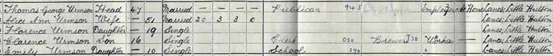 1901 census living with her parents in 328 Manchester Rd, Little Hulton, Lancashire.