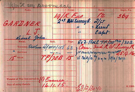 1917 May 30 MC Gazetted. 2nd Lt. Lionel John Gardner, R. West Surr. R., Spec. Res. For conspicuous gallantry and devotion to duty. He successfully attacked a party of the enemy on our flank and drove them out of their position. His courage and initiative undoubtedly saved a critical situation.