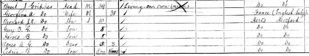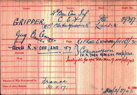 1918 Sep 18 MC citation gazetted. Lt. Guy Basil George Gripper, Herts.R. For conspicuous gallantry and devotion to duty. During a retirement he organised a party of men and by his skilful control prevented the enemy bringing machine guns into action. Later he helped to organise another party, and held, up the enemy for about two hours, rendering valuable assistance. Throughout he displayed great personal courage, and his example was of the greatest value to the troops under his command.