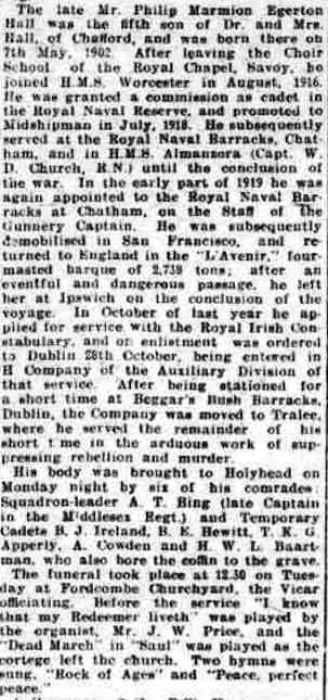 He was officially 19 when he died but he must have been only 18. The University Royal Naval Units, although under the jurisdiction of BRNC Dartmouth, are also a part of the Royal Naval Reserve. Students hold the honorary ranks of Officer Cadet (in their first year of enrolment) and Midshipman RNR (from the second year onward) provided they have completed the issued 'Taskbooks' to the satisfaction of the Commanding Officer of each unit P M E Hall must have come into this category