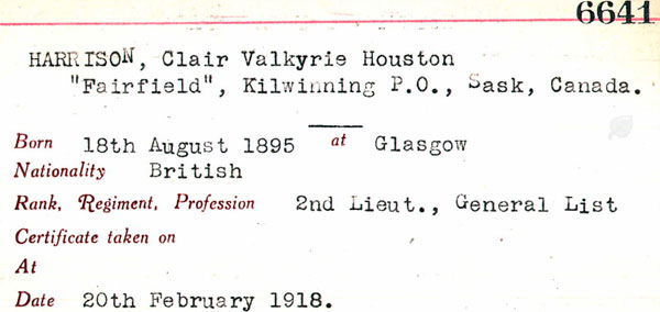1918 Jan 16. Commissioned in RFC, 2nd Lt, Pte. Clair Valkyrie Houston Harrison, from Canadian Inf