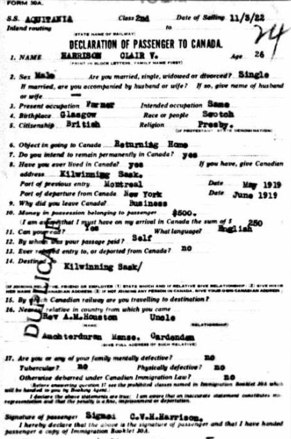 1922 Mar 17. Arrives in Canada from UK.