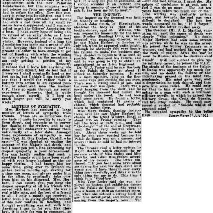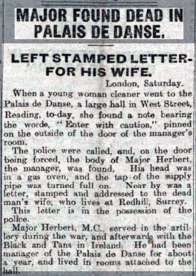 Daily Mail 11 Jul 1922. Insanity was returned at the inquest held on his body Major Herbert ...' It is better to go out quietly than live in poverty disgrace and misery and ran a letter to his wife left by Major manager of the Palais de Danse who was found dead with his..It was stated that it had been decided that the Palais de Danse Company should go into voluntary liquidation and Major Herbert felt very keenly his failure to make the place a success