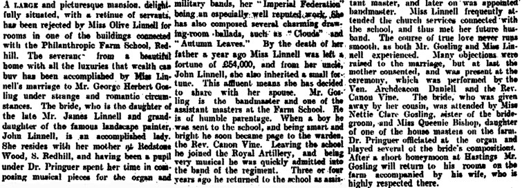 1906 Oct 7. Married Olive Linnell in Reigate from Army record. However state record says Olive Linnell and she marries a George Herbert Gosling . Undoubted she would have got some money from her father' will, which totaled £55,000, but given the 12 children and a wife to provide for, it is unlikely to me that James Linnell would have left more than about 5% to his youngest daughter, say around £3000. Still a tidy sum in those days.