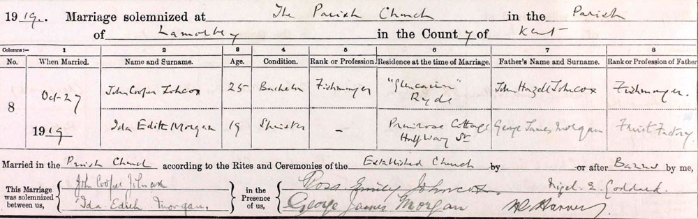 1919 Oct 27. Married in Bromley, Kent to Ida Edith Morgan (she died 1965). Divorced in 1938