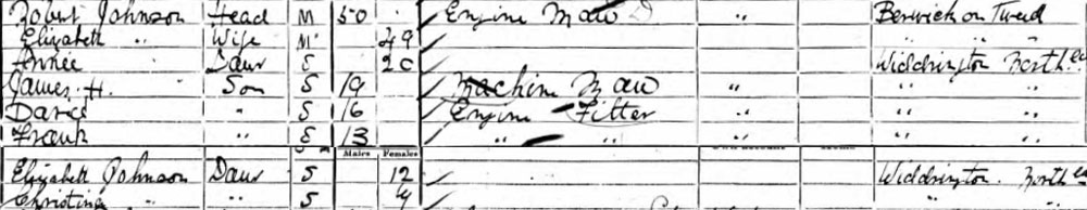 1871 Aug 8. Berwick upon Tweed Holy Trinity, Northumberland, Robert Johnson (son of John Johnson) marries Elizabeth Johnston (d. of John Johnston ) From a LDS transcript of parish register