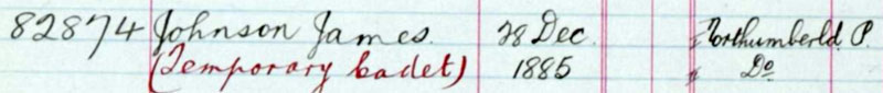 Trooper 1836 RHG gives his age as 25 yrs and 285 days on 13 Oct 1914 . States he was born in Widdrington but he enlists only as James Johnson, no middle name. At the time he states his father is Robert Johnson of 103 Hugh Gardens, Benwell. The examing doctor notd that Johnson had false teeth