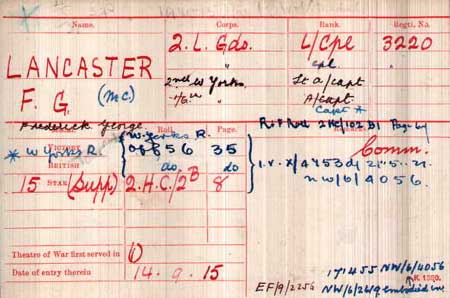 1917 Jan 10. Commissioned. The undermentioned W.O.s, N.C.O.s, and Men to be temp. 2nd Lts (on prob.) . W. York. R.—Lce.-Corpl. F. G. Lancaster, from 2nd Life Gds.