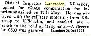1921 May 17. Wounded at Ballymalis, Co Kerry while with RIC. Awarded £300 compensation