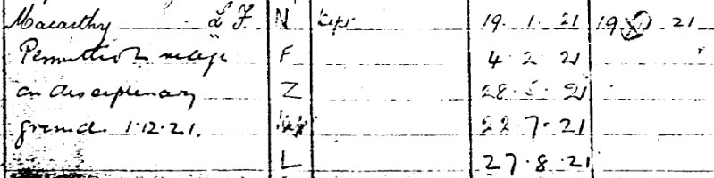 1921 Dec 20 8th Bn., Manch. R Relinquishes his commission with rank of Lt.— L F McCarthy (sic)