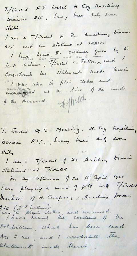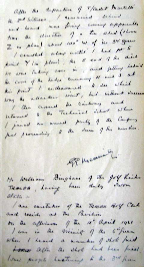 1921 Apr 15. Was playing golf when Major J A MacKinnon Commanding officer of H coy in Tralee was shot while off duty and playing golf in Tralee with DI.3 R W H Ballantine (ADRIC no 935). The IRA knew that he played golf here regularly, and had kept watch on the golf course for about 2 weeks before their chance came. The hit squad was a sniper with a rifle, James Cornelius Healy a veteran of WW1, and three men with shotguns, Johnny Riordan, Tommy Barrett and Jack Mason. Healy hid in a tree overlooking the third green and waited till Mackinnon was perfectly still as he shaped to hit the ball. Healy shot MacKinnon twice in the head. The others opened up with shotguns, and all the IRA men were able to escape in the resulting confusion. The Auxiliaries went on a spree of arson and killing, which in turn led to IRA killings. Mearing gave evidence at the inquest