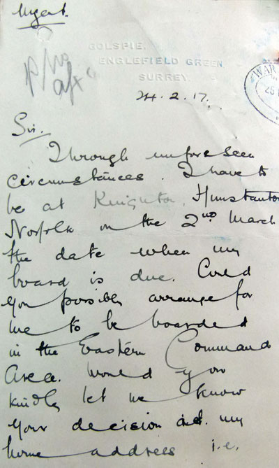 1917 Feb 24. Tries to get a Medical Board changed.