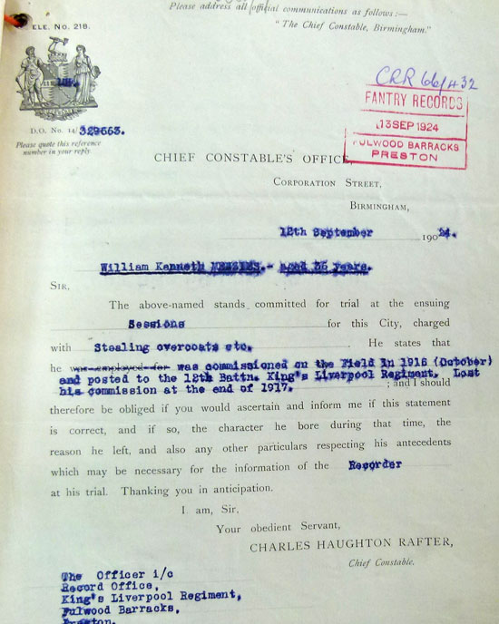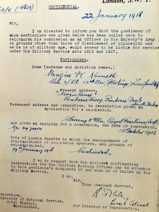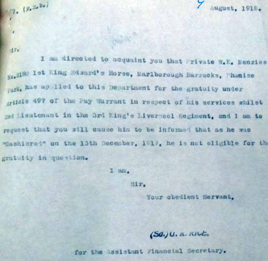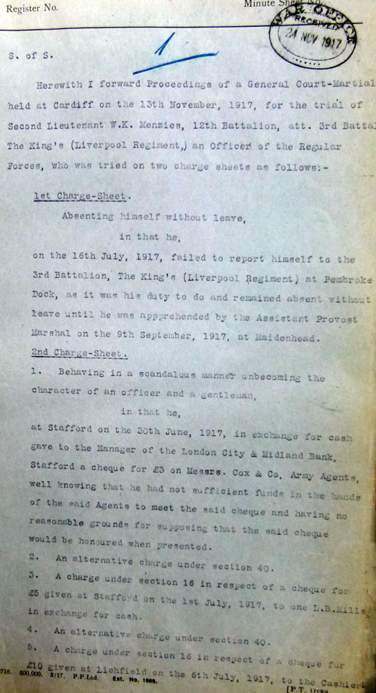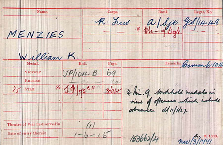 1916 Oct 15. Commissioned 2nd Lt. L'pool R:—Serjt. W. K. Menzies, from a Ser. Bn., R. Fus.(his officers service record is in name of William Kenneth Menzies)