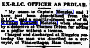 1888 Jan 20. Born Egham, Surrey as "William Menzies" One can see that it is the same man in 1911 census with Kenneth added.