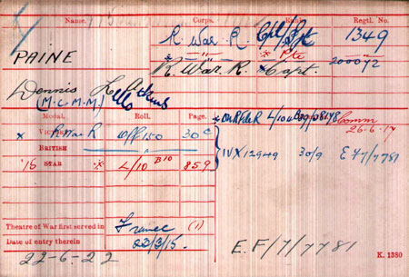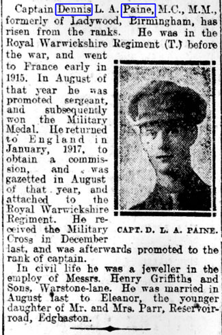 1917 Jul 27. Citation for MC Gazetted. T./2nd Lt. Dennis Lello Adkins Paine, M.M., R. War. R. For conspicuous gallantry and devotion to duty. When his company were subjected for three days to determined attacks of the enemy, who attempted to gain a footing on a ridge, he organised and led bombing parties on four separate occasions to eject the enemy from the trenches in which he was advancing, and upon each occasion was successful. His courage was of a very high standard, and was a fine example to his command