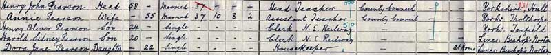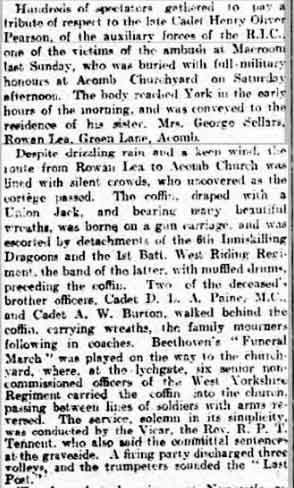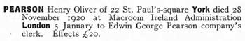 The man who died at Kilmichael was called "Henry Oliver Pearson". Probate was granted to" Edwin George Pearson". The 1901 census shows them brothers living in York, and undoubtedly the 1911 census in York is therefore the right man. He joined the Yorkshire Regt, was commissioned in June 1918, and court-martialed soon after that, and lost 6 month seniority